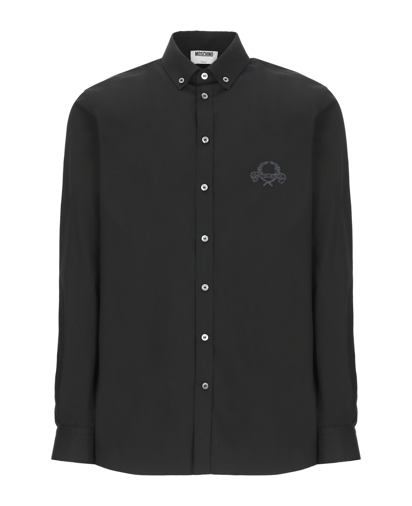 - Black Moschino cotton shirt for man - Collar - Short sleeves - Front contrasting color embroidered logo - Front buttons fastening Composition: 100% Cotton Made in: Portugal Color: Black Size and fit: - Model's height is 190 cm and he wears a size S Model number: 022552351555