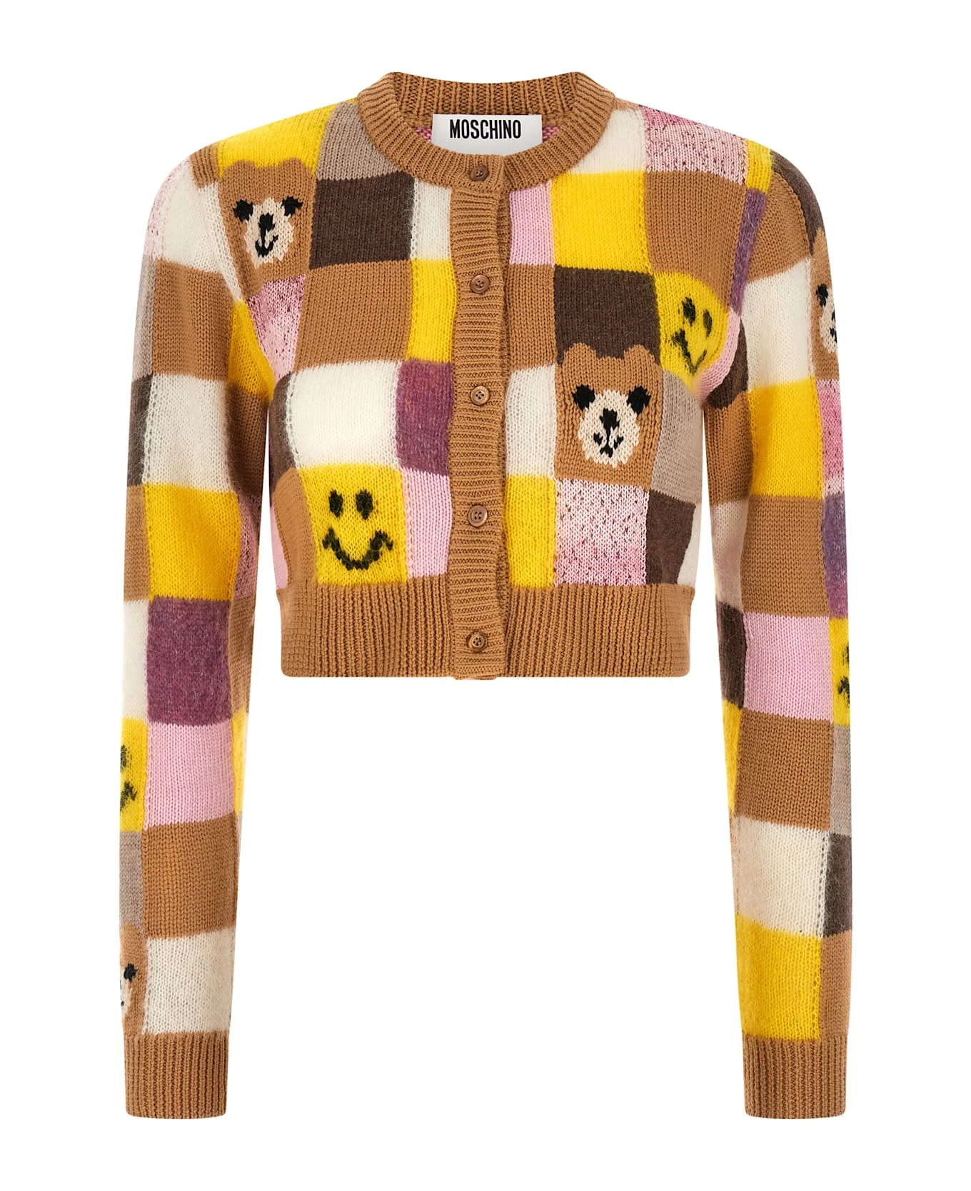 Cardigan in wool and cashmere blend with check pattern intarsia with 'Smiley® e Moschino Teddy Bear', crop model, crew neck, front button closure, long cuffed sleeves. Composition: Made in: Italy Color: Yellow Size and fit: - true to size fit Model number: A091205051079