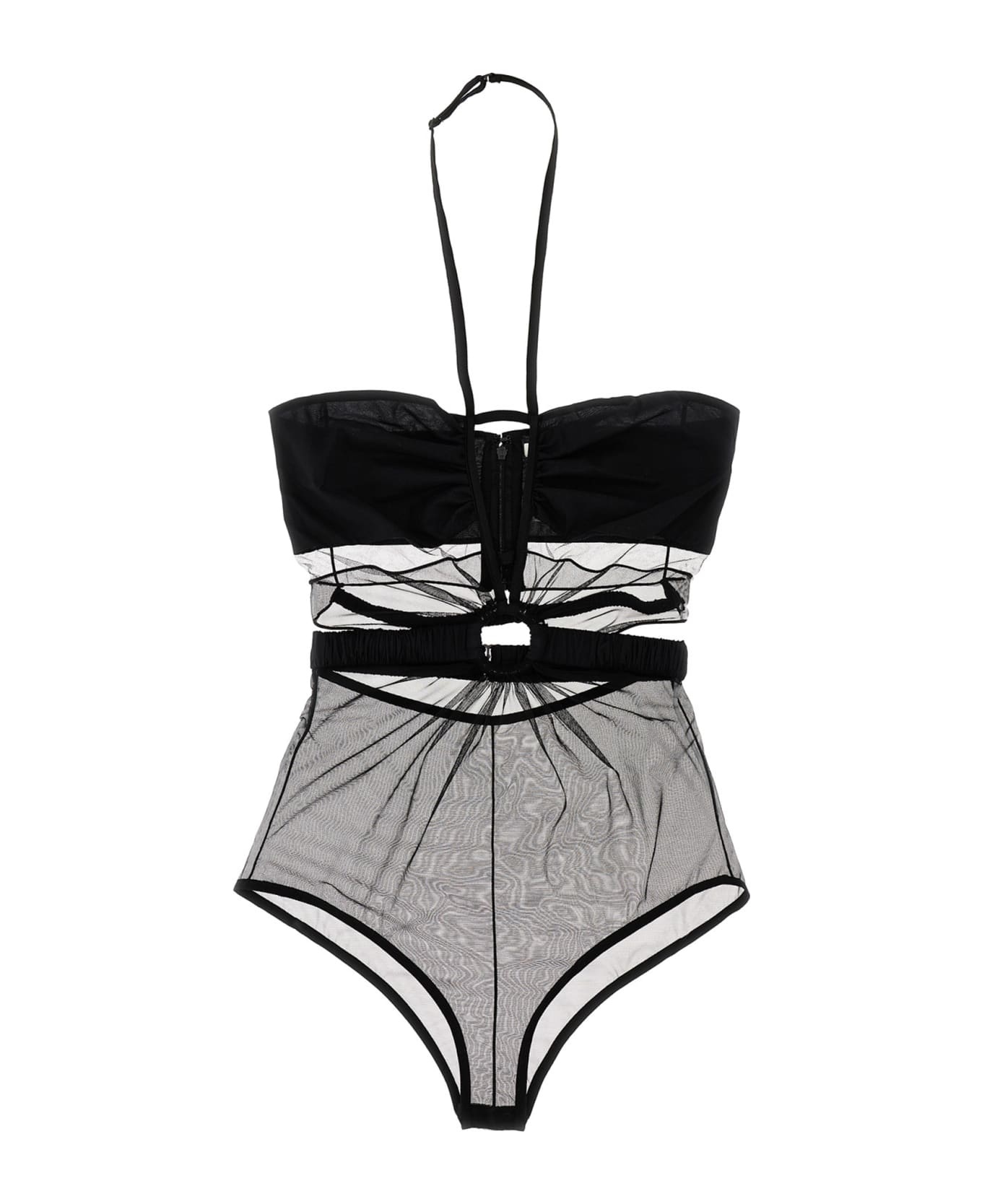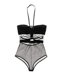 Ring' mesh fabric bodysuit with cut outs, bare back, deep V-neck, adjustable shoulders. Composition: 82% polyamide 18% elastane Color: Black Size and fit: - True to size fit Model number: NDSS23TOP039BLACK