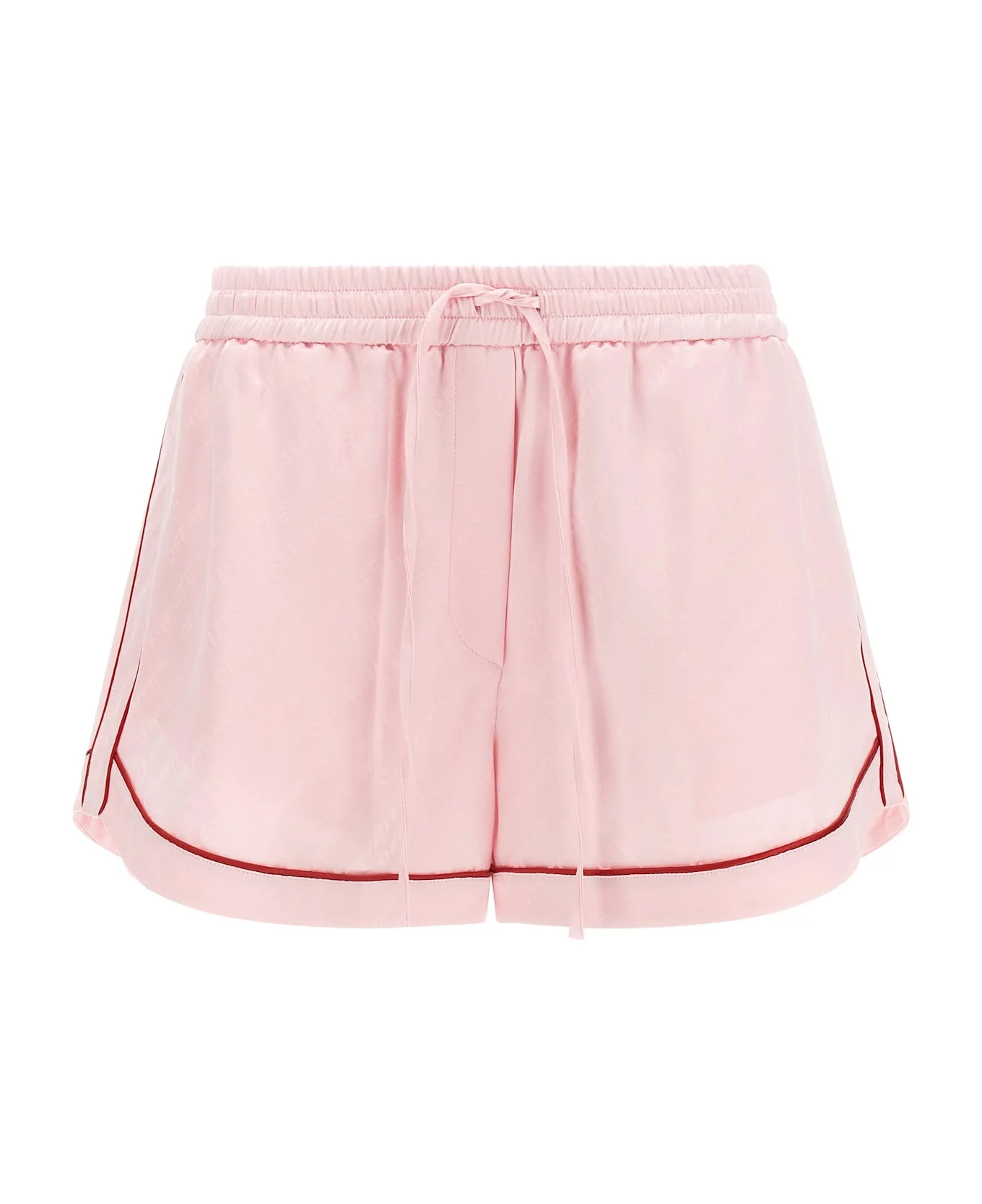 'Jacquard Satin Pajama' shorts in jacquard satin with all-over logo with solid color contrast piping, pajama model, drawstring elastic waistband, wide leg, pockets. Composition: 64% viscose 34% polyester 2% elastane Made in: Italy Color: Pink Size and fit: - true to size fit Model number: OWCB05IS26FAB0013C003C00