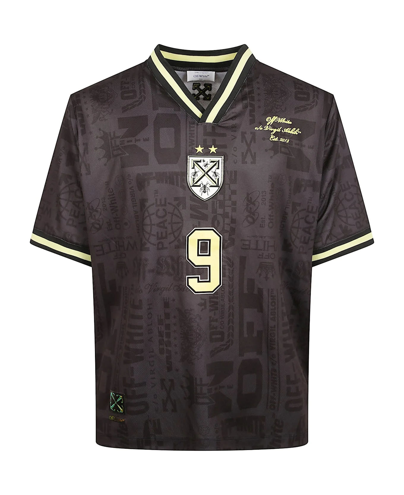- Crafted from premium fabric showcasing a multilogo pattern. - Features a V-neckline and short sleeves for a relaxed fit. - Distinctive numerical emblem prominently displayed on front and back. - Signature Off-White branding elements integrated into the design. - Contrasting trim highlights the neckline and sleeves. Composition: 100% Polyester Made in: Portugal Color: BLACK - BLACK Model number: OMAD00SF25JER0021010