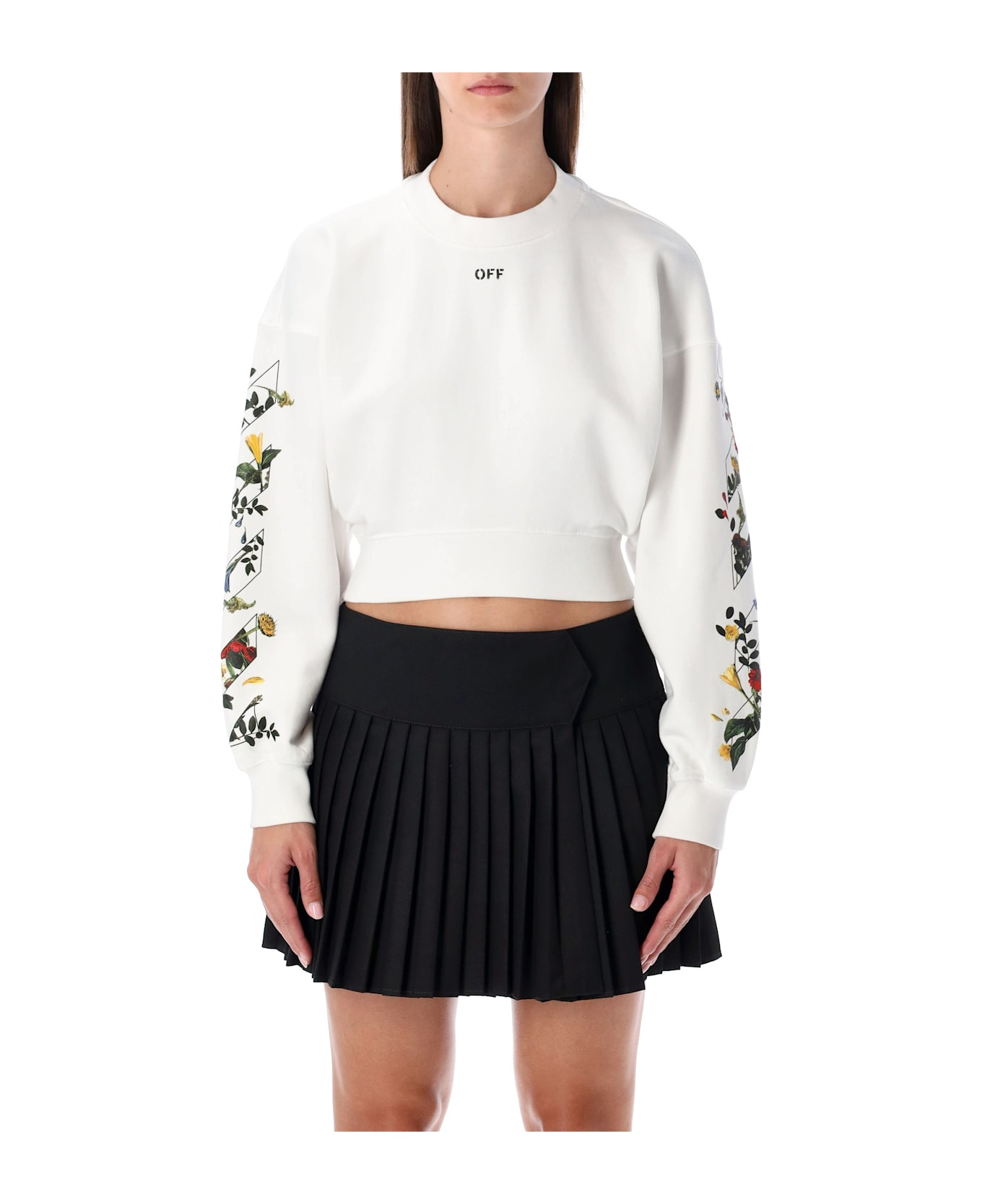The Off-white Arrow Flowers Crop Crew Sweatshirt Blends The Brand s Urban Dna With Nature-inspired Graphics. Crafted From Premium Cotton, It Features A Modern Cropped Silhouette With A Crew Neckline And Subtle off Lettering On The Front. Long Sleeves And The Back Panel Are Adorned With The Iconic Floral Arrow Design, Adding A Bold Yet Refined Touch To This Contemporary Streetwear Piece. Crew Neckline off Lettering At Front Long Sleeves With Floral Arrow Motifs Signature Floral Arrow Design At Back Ribbed Hem And Cuffs Cropped Fit Alessandra Is 1,75 M And Wears Size S Composition: 100% cotton Made in: Portugal Color: WHITE Model number: OWBA079F25FLE0010110