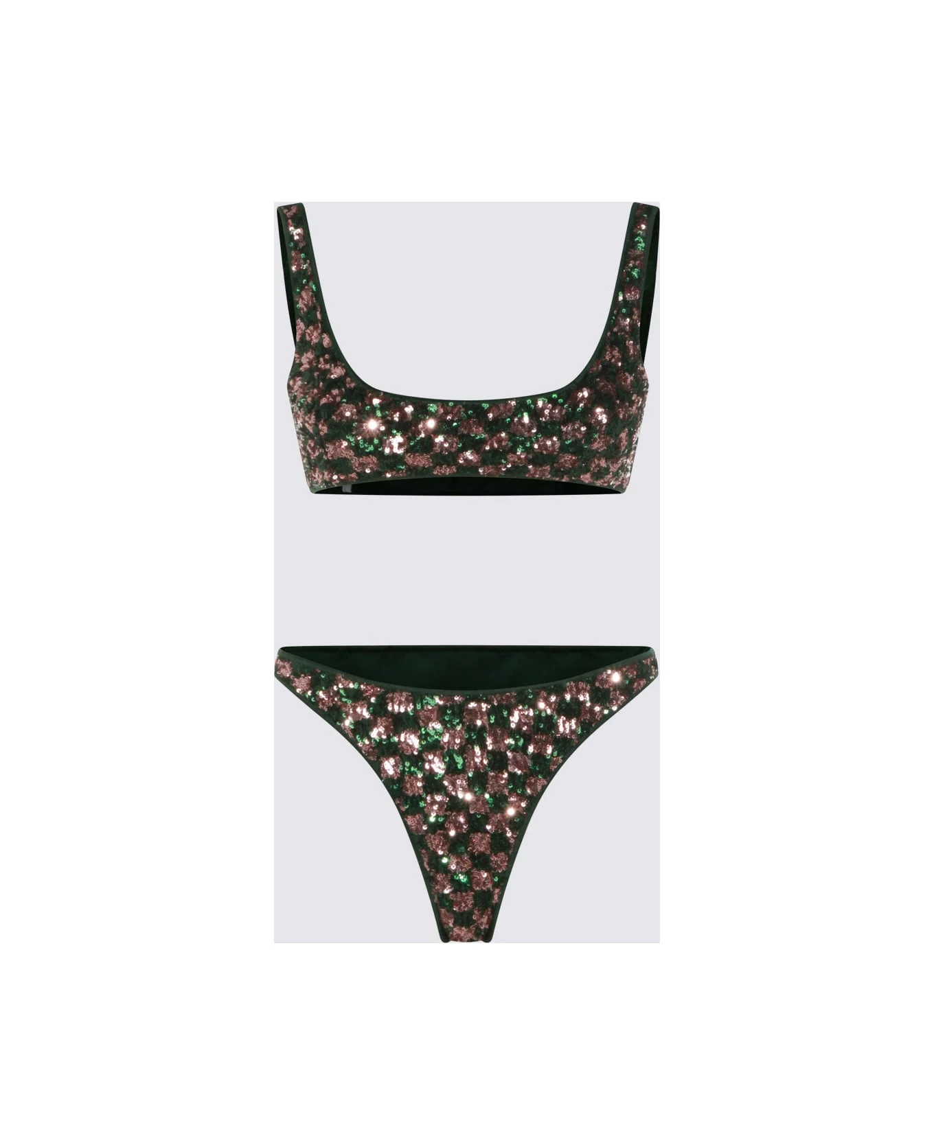 Green and pink Sequins Chess beachwear from Oseree featuring two pieces, square necklaces, sleeveless and all over pailettes. Composition: 80% Pa -, 20% Elastane Made in: Italy Color: PINK/GREEN Model number: CSS261PINK/GREEN