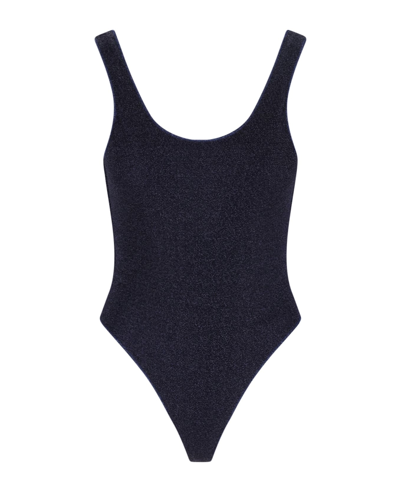 Oseree "Lumiere Sporty Maillot" one-piece swimsuit in blue lurex with metallic details, round neckline, thin straps, deep neckline at the back, high-cut design. Composition: 64% Polyamide, 36% Metallized Fibers Made in: Italy Color: Blue Size and fit: - vestibilita regolare Model number: LIS250NIGHTBLUE