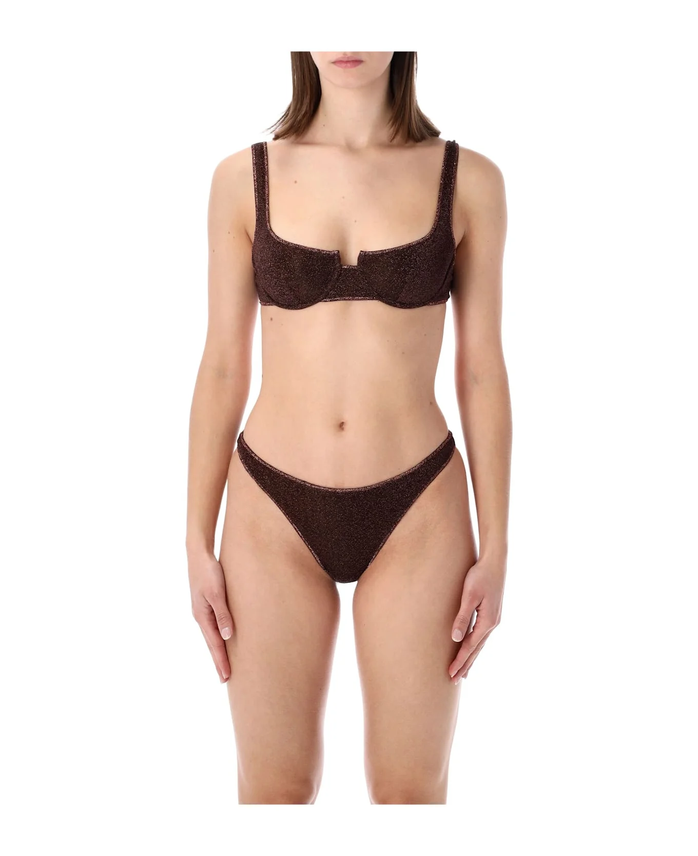 The Lumiere Balconette Bikini By Oseree Swimwear Embodies Refined Swimwear Design Through A Shimmering Lurex Fabric With A Luminous Finish. The Balconette Top Features Structured Cups That Enhance And Support The Silhouette, While The Matching Bottoms Offer A Clean, Minimal Line For A Balanced And Elegant Look. Designed For Elevated Beachwear, It Transitions Seamlessly From Poolside Lounging To Exclusive Resort Settings. Shimmering Lurex Fabric Balconette Top With Shaped Cups Slim Shoulder Straps Adjustable Back Closure Matching Regular-rise Bottoms Fitted Silhouette Alessandra Is 1,75 M And Wears Size S Composition: 64% polyamide, 36% metallic fiber Lining, 80% polyamide, 20% elastane Made in: Italy Color: CHOCOLATE Model number: LAF257CHOCOLATE