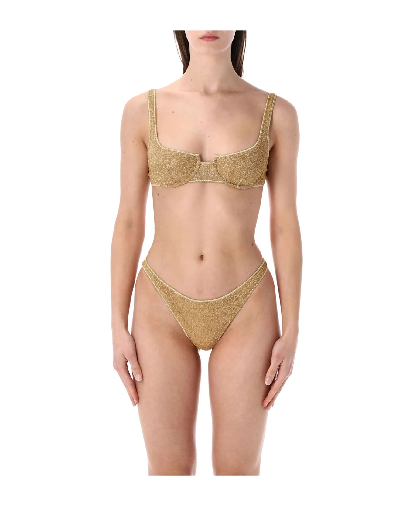 The Lumiere Balconette Bikini By Oseree Swimwear Embodies Refined Swimwear Design Through A Shimmering Lurex Fabric With A Luminous Finish. The Balconette Top Features Structured Cups That Enhance And Support The Silhouette, While The Matching Bottoms Offer A Clean, Minimal Line For A Balanced And Elegant Look. Designed For Elevated Beachwear, It Transitions Seamlessly From Poolside Lounging To Exclusive Resort Settings. Shimmering Lurex Fabric Balconette Top With Shaped Cups Slim Shoulder Straps Adjustable Back Closure Matching Regular-rise Bottoms Fitted Silhouette Alessandra Is 1,75 M And Wears Size S Composition: 64% polyamide, 36% metallic fiber Lining, 80% polyamide, 20% elastane Made in: Italy Color: GOLD Model number: LAF257GOLD