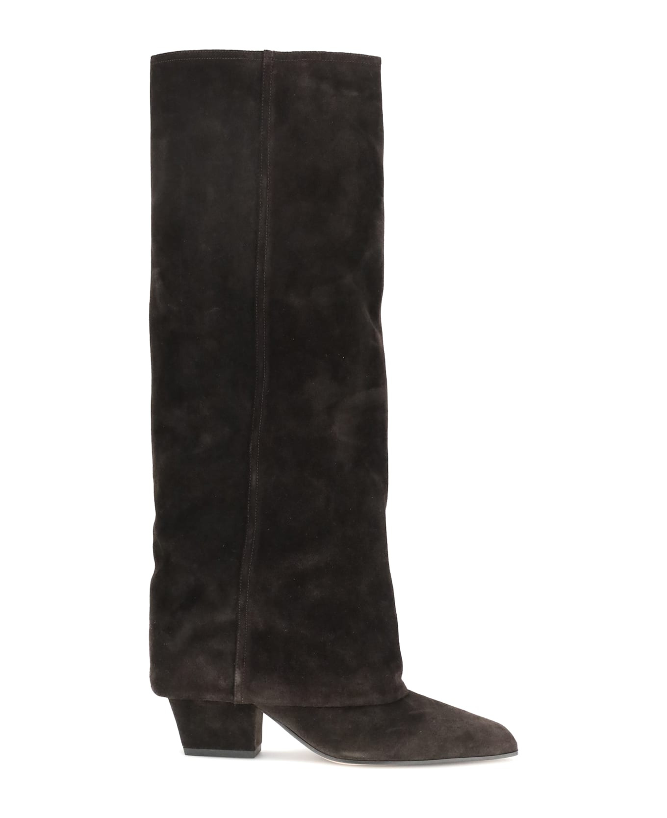 The jane high boots by paris texas are made of ebony-colored calfskin suede with a square toe and distinctive turn-up. the texas heel slims the figure and completes a sophisticated design with a contemporary western style. Composition: 100% % Calf Leather Bos Taurus Made in: Italy Size and fit: - 6 cm Model number: PX1803XV003EBANO