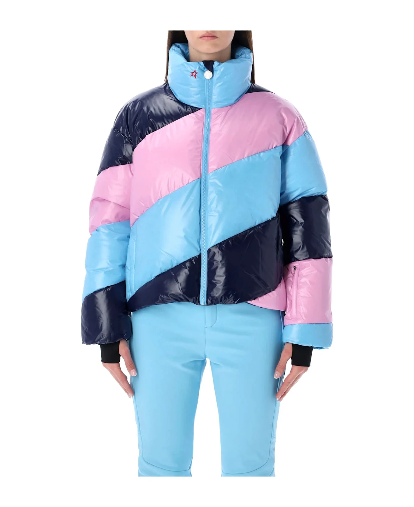 The Perfect Moment Super Mojo Brings Back A Brand Classic With Its Bold Diagonal Padding And Fresh Multicolor Palette In Blue And Lilac. Featuring A Relaxed, Hip-length Fit, Water-resistant Technical Fabric And 700-fill-power Down, It Offers Warmth And Style For Full Ski Days. An Adjustable Snow Skirt, Internal Goggle Pocket And Recco® Technology Elevate Its Mountain-ready Functionality. Relaxed Hip-length Fit Full Zip Closure Front Zip Pockets External Ski-pass Pocket Internal Pockets Including Goggle Compartment Adjustable Snow Skirt High-neck Collar 700-fill-power Down Insulation Recco® Technology Alessandra Is 1,75 M And Wears Size S Composition: 71% polyamide, 29% polyurethane Lining, 100% recycled polyester Insulation, 80% duck down, 20% feather Made in: China Color: PINK AZZURRO BLUE Model number: W30011842327