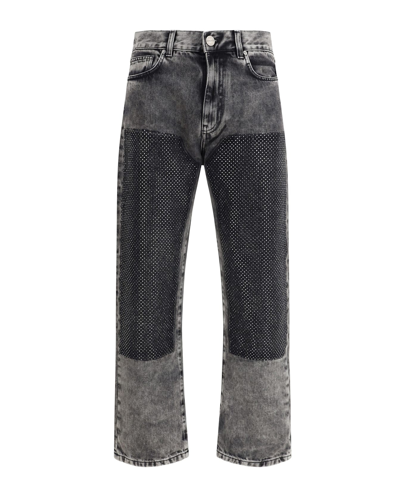 The pinko five-pocket jeans in black stone-washed denim feature a loose-fit, contrast patches, and small faceted studs, with mid-rise waist, belt loops, and zip and button closure, combining workwear style with contemporary details. Composition: 100% % Cotton Model number: 104635A2W4PJ9
