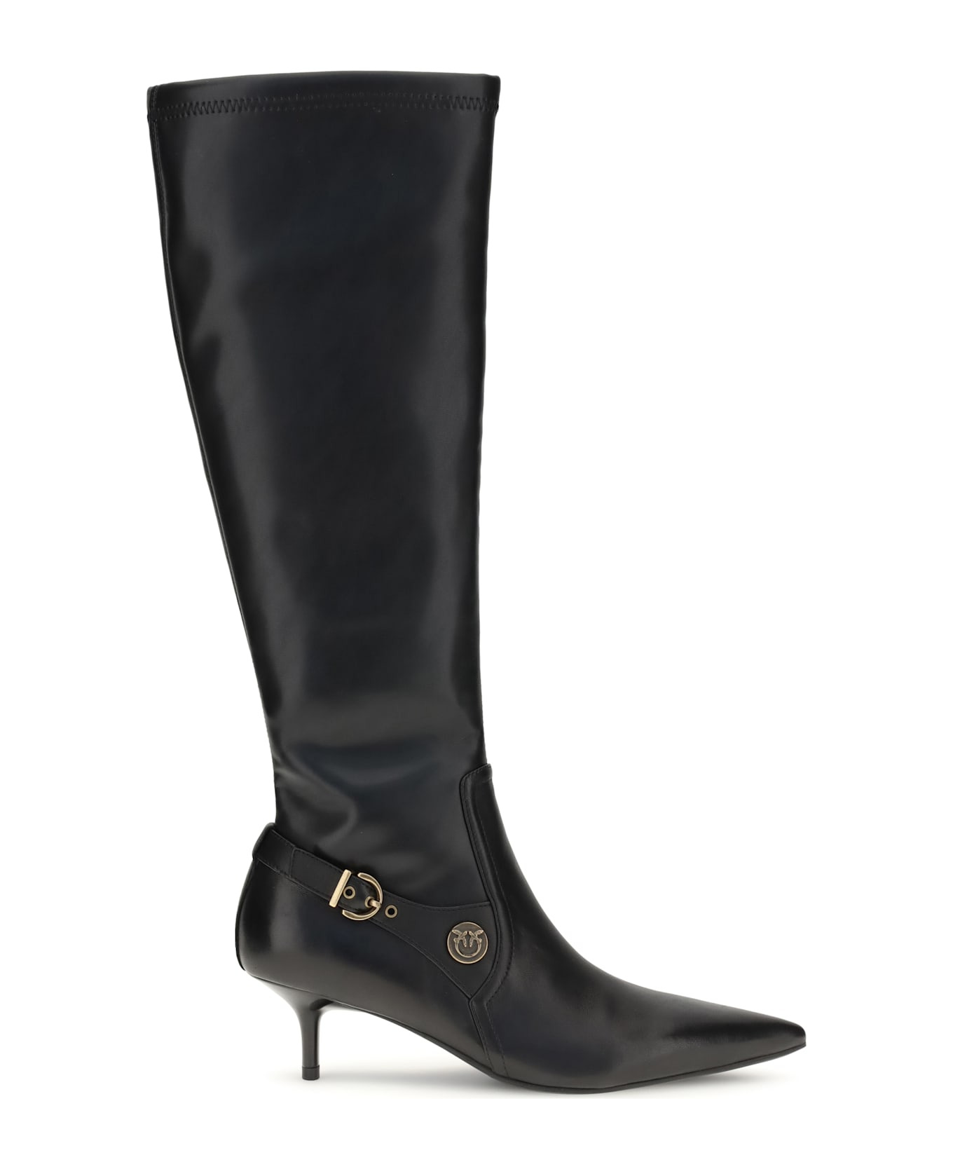 Pinko's knee-length boots are made of fine soft and smooth nappa leather, with leggings equipped with internal zippers for easy wearing and refined straps with metal loops. rounded toes and thin, high heels give these styles a feminine yet assertive look. leather lining, lightly padded leather insoles and soles made of tunit, a synthetic material that mimics the characteristics of leather, complete the shoes. Composition: 100% % Goatskin/hircus Goatskin Made in: China Size and fit: - 8.5 cm Model number: SD0369E028Z99BLACK