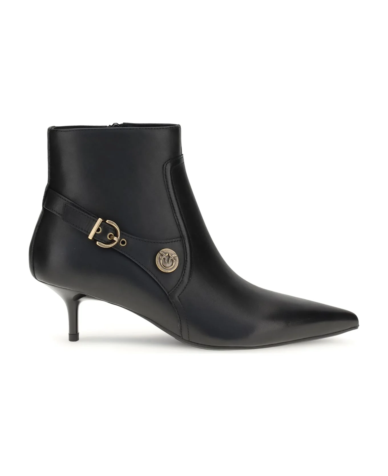 Pinko's leather ankle boots combine elegance and comfort with their refined almond toe and practical side zipper closure. the kitten heel lends a feminine touch, while the logo buckle on the side adds a distinctive detail that completes the design. Composition: 100% % Calf Leather Bos Taurus Made in: China Size and fit: - 4 cm Model number: SD0367P087Z99BLACK
