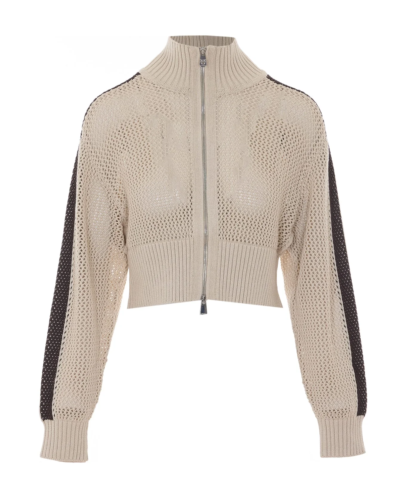 Pinko beige and brown Spazio track jacket, mesh, cropped and knitted, zip closure, with band on shoulders Composition: 62% Cotton, 38% Nylon Made in: China Color: Grey Size and fit: - US SIZE Model number: 106839A3B4C44
