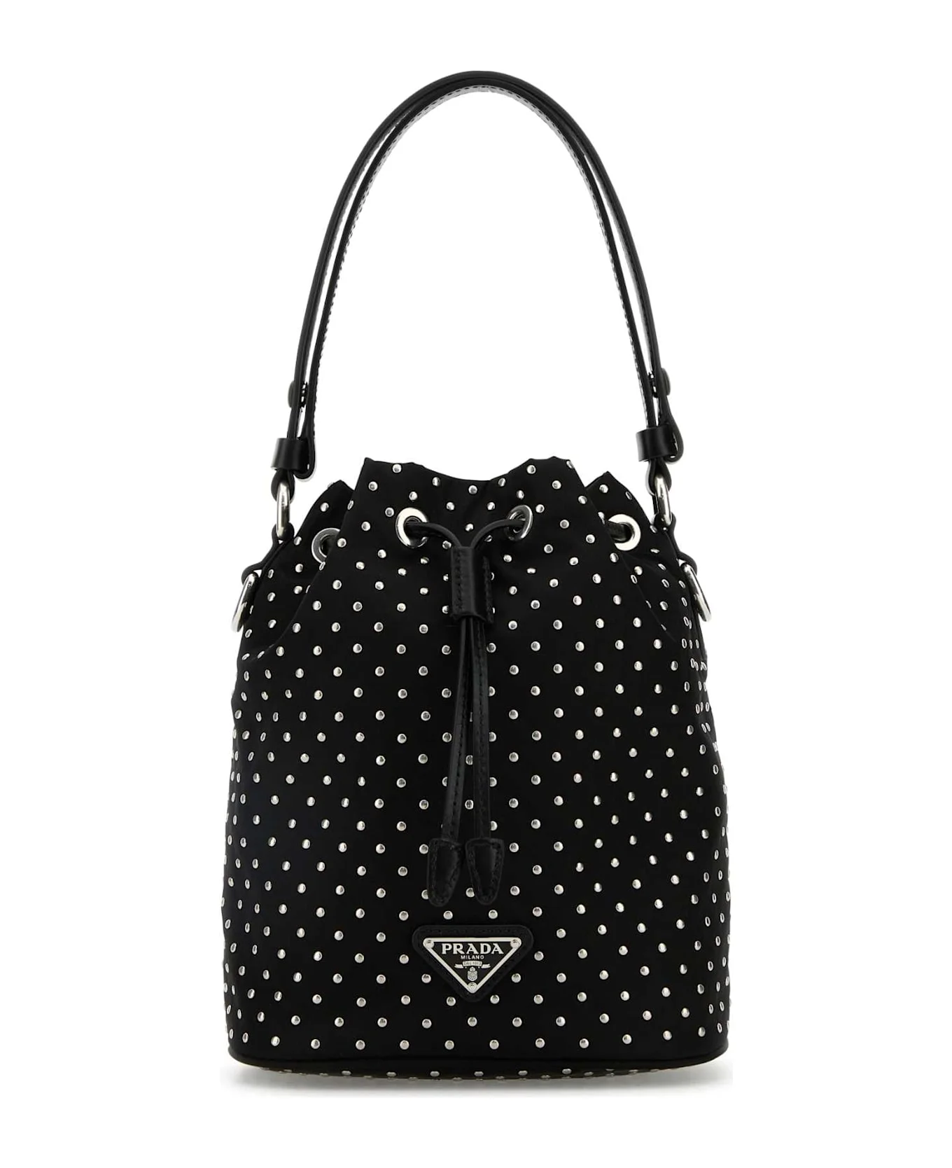 Black Re-nylon Bucket Bag from Prada Made in: Italy Color: NERO Size and fit: - Width: 17 cm Height: 18,5 cm Depth: 10,5 cm Handle height: 12 cm Min shoulder strap length: 49,5 cm Max shoulder strap length: 57 cm Model number: 1BE067VOOM2HGVF0002