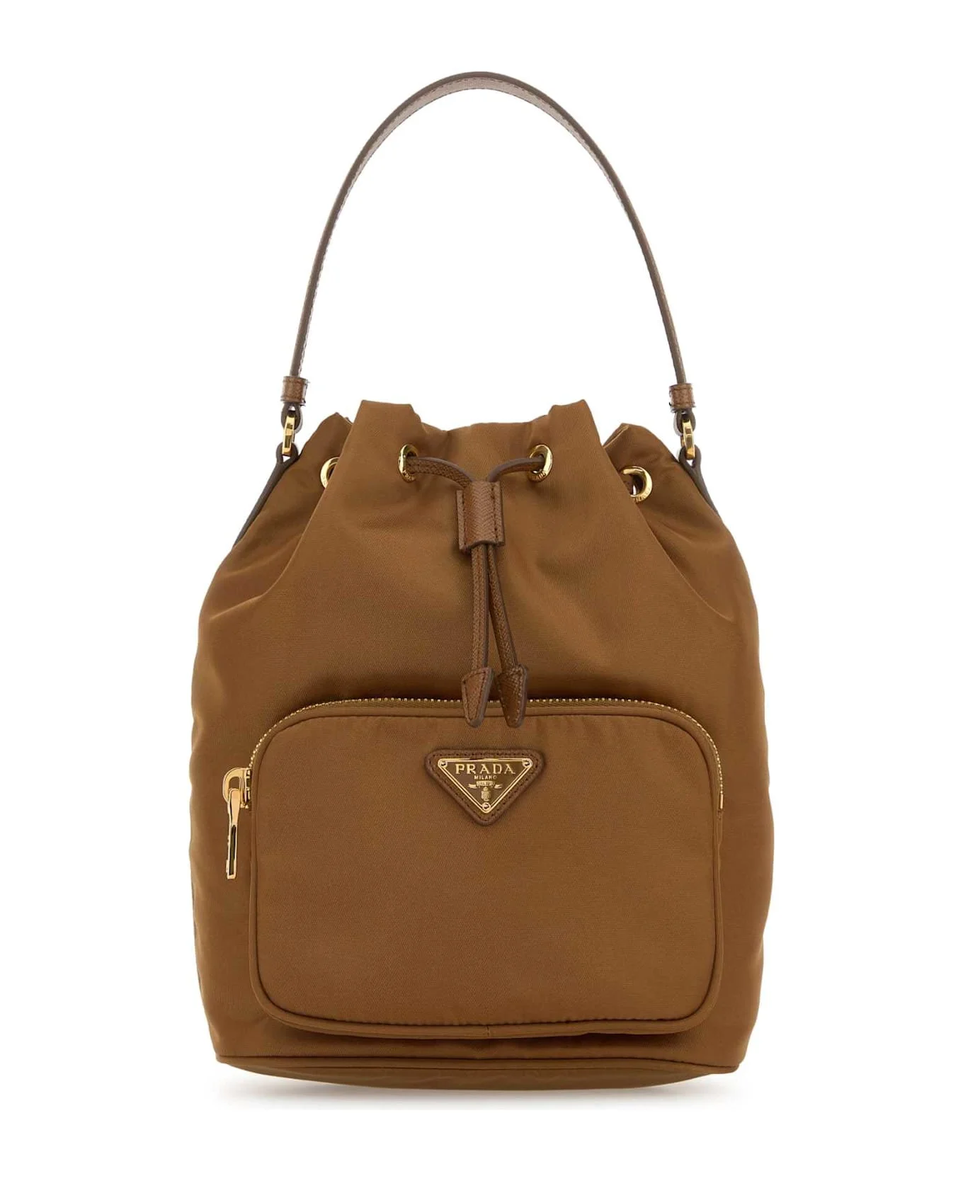 Caramel Re-nylon Duet Bucket Bag from Prada Made in: Italy Color: BRANDY Size and fit: - Width: 18 cm Height: 23 cm Depth: 12,5 cm Handle height: 11 cm Min shoulder strap length: 60 cm Max shoulder strap length: 64 cm Model number: 1BH038VUOPRV44F0134