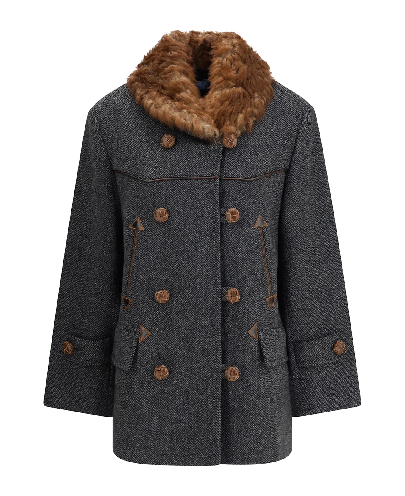 Double-breasted caban by prada, finished with a soft shearling trim. featuring classic lapels and a buttoned double-breasted closure, it embodies refined contemporary elegance. an iconic outerwear piece that combines timeless lines with exquisite detailing. Composition: 100% % Fleece Wool Made in: Italy Model number: P653SPSOOO17VQF0308