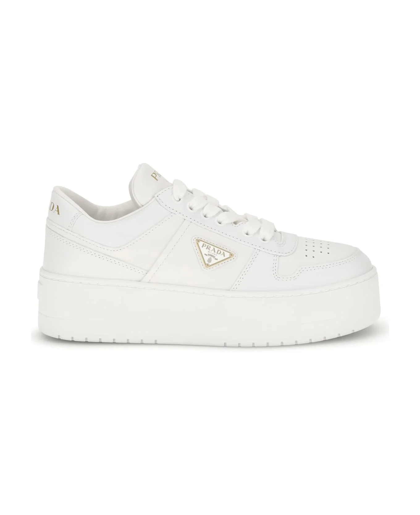 Downtown bold sneakers by prada, inspired by the basketball styles of the 1980s. made of perforated leather, the shoes are reinterpreted with platform soles that give the silhouette a distinctive and contemporary character. different interpretations of the prada logo sign the model, complemented by the iconic geometry of the enameled metal triangle. Composition: 100% % Calf Leather Bos Taurus, 100% % Rubber Made in: Italy Size and fit: - 4 cm Model number: 1E792MFD0503LPHF0009