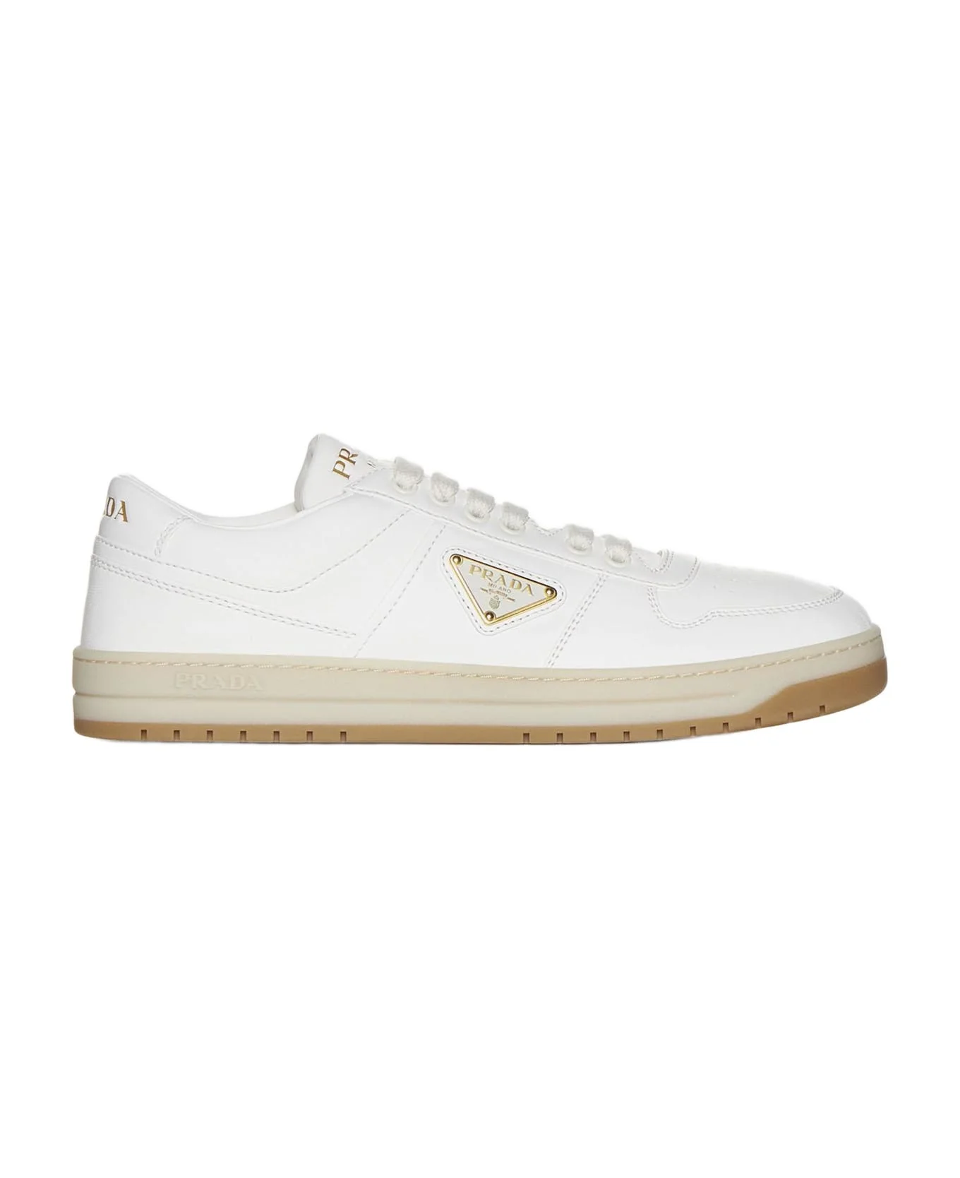 Prada's Downtown ivory leather sneakers featuring logo on the tongue, laces fastening, round toe, side triangle logo plaque, back logo print and rubber sole with logo embossed on the side. Composition: 100% lambskin Made in: Italy Color: Avorio Model number: 1E792M038