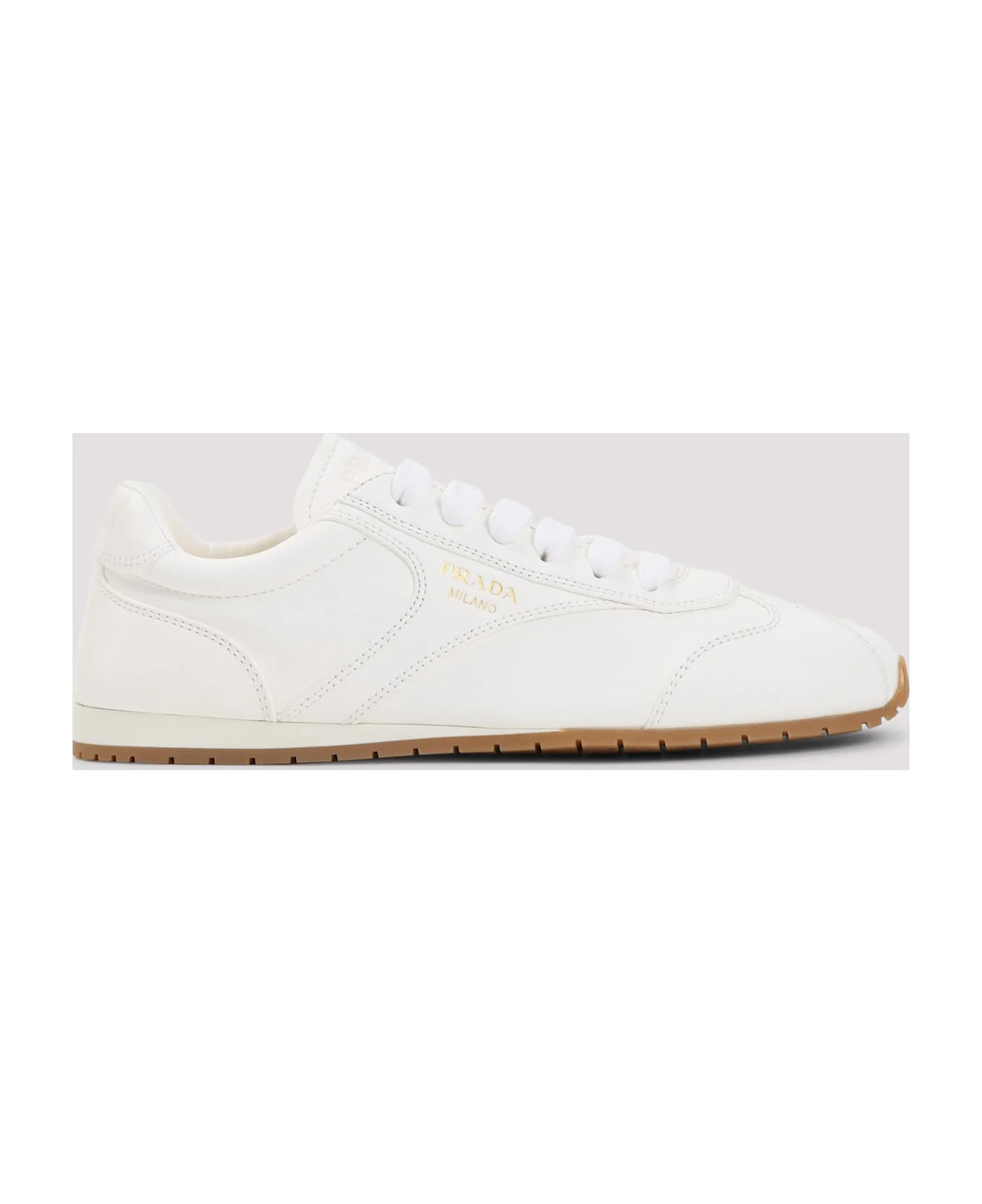 Prada Ivory Lamb Leather Sneakers. Crafted from ivory lamb leather, featuring a round toe, lace-up fastening, an embossed logo on the tongue and on the heel, a leather lining and a leather insole, and a flat rubber outsole. Made in: Italy Color: Avorio Model number: 1E152OF020038F0304