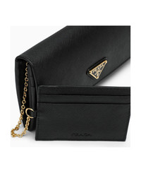 Large continental wallet by Prada in black Saffiano leather with an enamelled metal triangle logo on the front, a snap button closure, two note compartments, ten card slots, four internal pockets, an internal coin pocket with zip, an external back pocket with zip and a removable badge holder. Composition: 100% Leather Made in: Italy Color: Nero Size and fit: - Width 19 cm x Height 9.5 cm x Depth 2 cm Model number: 1MH132QHH