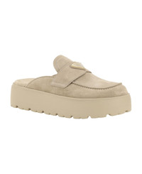 Prada's suede mules are an elegant and sophisticated loafer style. the round toe offers a comfortable fit, while the iconic triangular plaque applied to the front adds a distinctive brand touch. the wedge gives a high fit without sacrificing comfort, while the branded insole completes the design with a luxurious detail. Composition: 100% % Rubber, 100% % Calf Leather Bos Taurus Made in: Italy Model number: 1XZ778F045054F0379