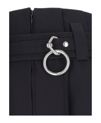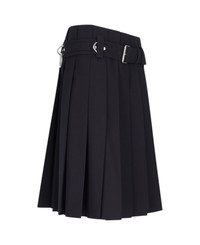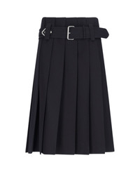 Prada logo midi skirt in blue wool, navy tone, pleated design, low waist, adjustable waistband detail, belt loops, buckle with silver brass detailing, engraved logo, side zip fastening, straight hem. Composition: 100% Wool Made in: Italy Color: Blue Size and fit: - vestibilita: regolare Model number: P184YHOOO