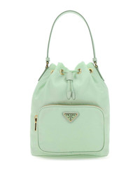 Pastel Green Re-nylon Bucket Bag from Prada Made in: Italy Color: F0934 Size and fit: - Width: 18 cm Height: 21 cm Depth: 12 cm Handle height: 13 cm Min shoulder strap length: 47 cm Max shoulder strap length: 54 cm Model number: 1BH038VUOORV44F0934