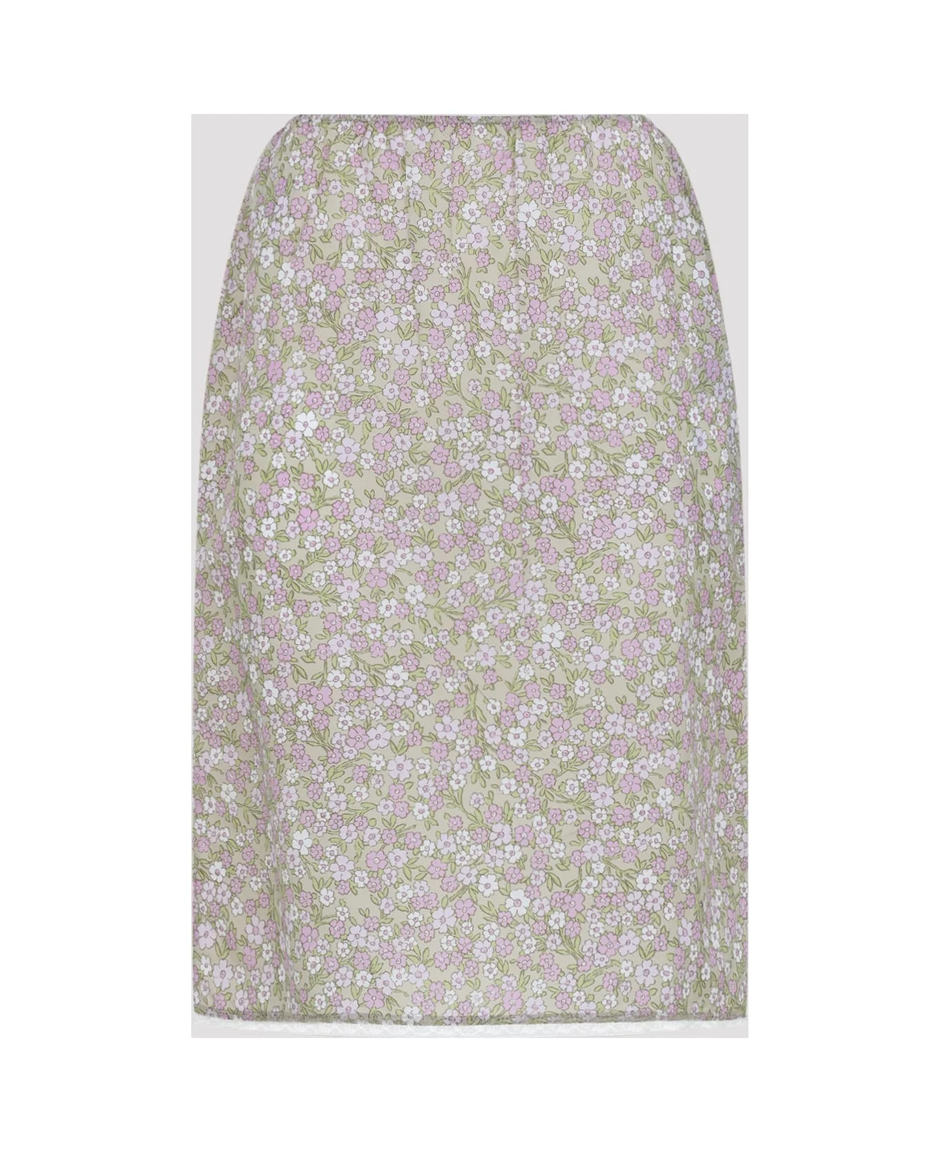 Prada Green Polyamide Midi Skirt. Crafted from green tech fabric with a lilac and white floral print all over, featuring an elastic waistband, a tonal triangle logo detail on the back, and a white lace trim. Made in: Italy Color: Alabastro Model number: 21H037SOOO19DIF0E18