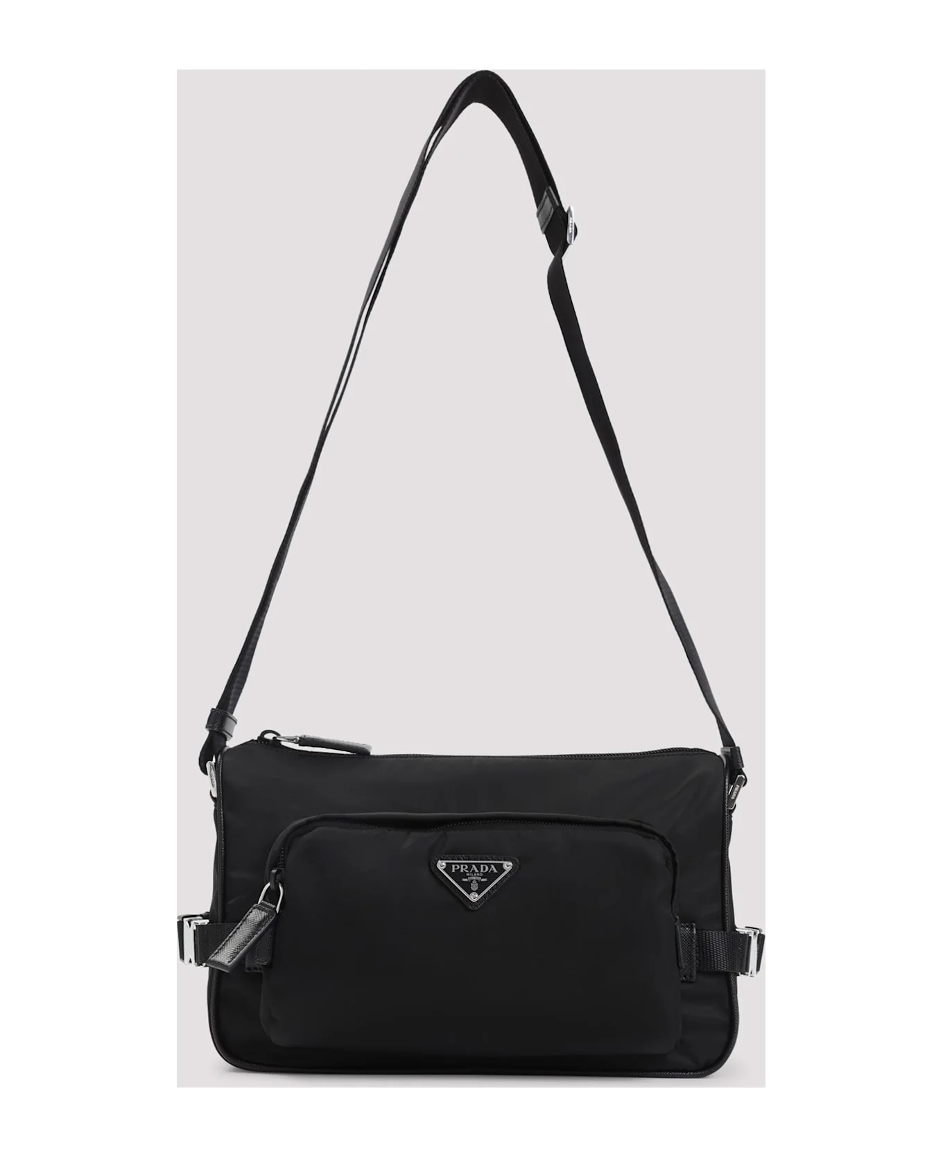 Prada Black Re-Nylon and leather shoulder bag. Black Saffiano leather and Re-nylon, adjustable nylon tape shoulder strap, zip fastening, zipped pocket. Enameled metal triangle logo on the front, Logo-print Re-Nylon lining, External zipper pocket. Made in: Italy Color: Nero Size and fit: - W:28cm H:18cm D:10cm Model number: 2VH192VOOO2DMGF0002