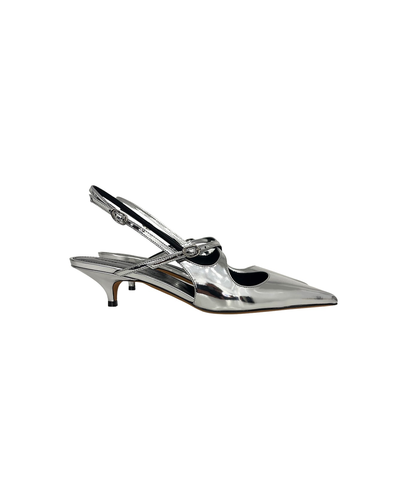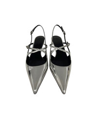 Proenza Schouler Slash Crossover Slingback Pumps, metallic finish, pointed toe and a 40mm kitten heel, crossover straps and adjustable silver-tone buckles. GTIN code: SH252038 F001WF Made in: Italy Color: Silver Size and fit: - Heel 4 cm Model number: SH252038F001WF