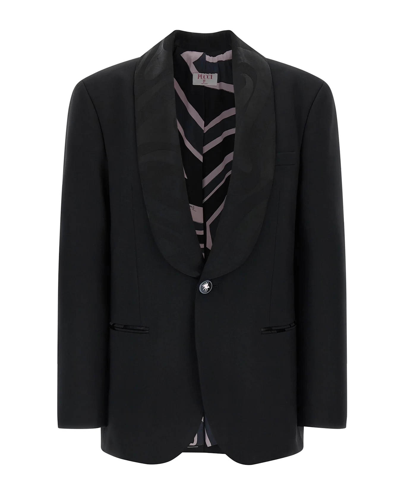Virgin wool single-breasted blazer with front button closure, shawl collar in viscose, wool and silk with tonal 'Labirinto' print, breast pocket, patch pockets, padded shoulder, long sleeves, back split, 'Labirinto print silk lining'. This product, like many other Pucci items, is made with an all-over print that falls differently on each garment The product shipped may differ from the one in the picture. Composition: 95% virgin wool 5% elastane Made in: Italy Color: Black Size and fit: - true to size fit Model number: 5URB055U606999