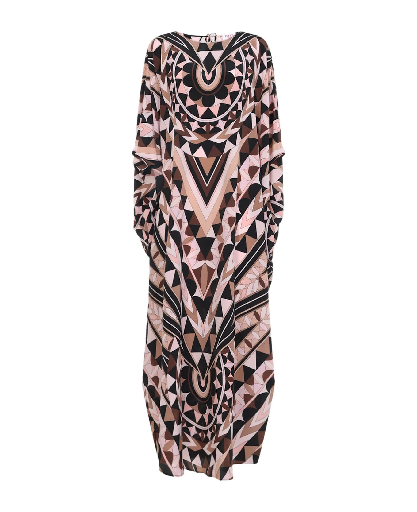 Pucci Pink Silk Long Dress. Kaftan design crafted from pink, black, and beige silk with an all-over signature print, featuring a V-neckline, cape sleeves, a teardrop cut-out with self-tie fastening at the back of the collar, and a flared hem. Made in: Italy Color: Nude Model number: 6HRL486H773039