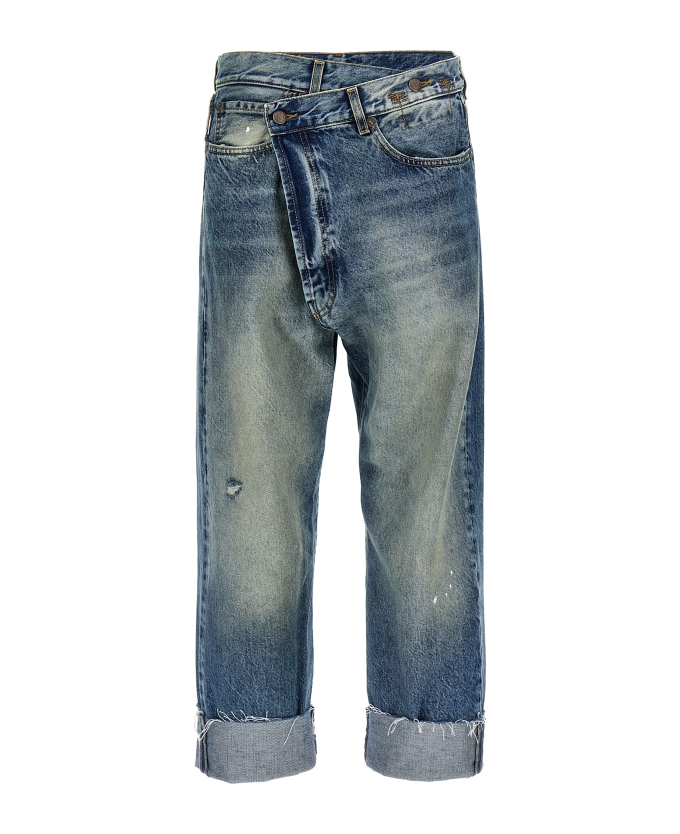 Delave cotton denim 'Cross Over' jeans with small rips and patent leather spots, asymmetrical button closure, five pockets, leather salpa, raw cut lapels on bottom leg. Composition: 100%cotton Made in: Italy Color: Light Blue Size and fit: - fit true to size Model number: R13W2048735JASPER
