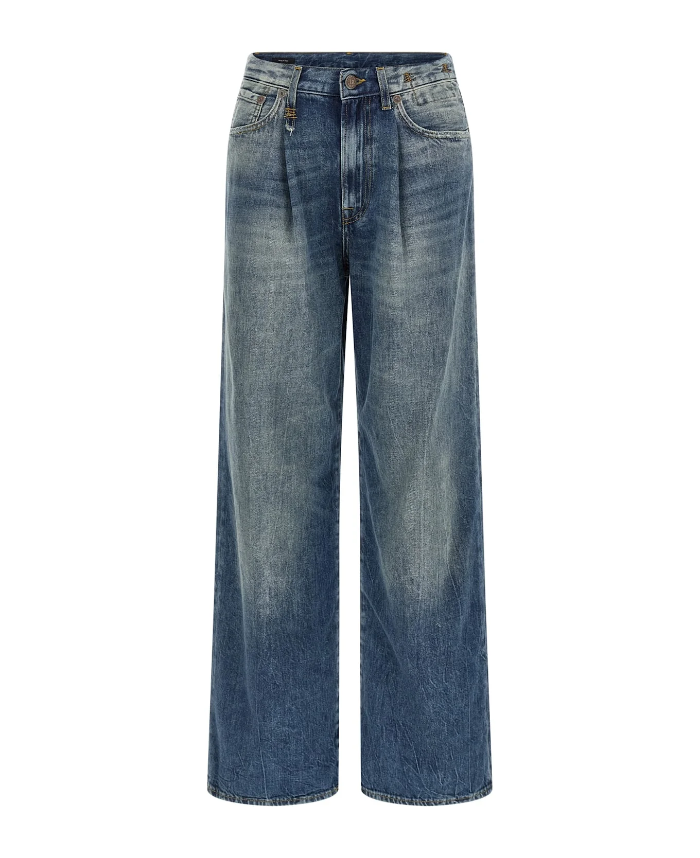 High-waisted delave cotton denim jeans Damon with wide pleated leg, zip and button closure, five pockets, and back logo tag. Composition: 100% cotton Made in: Italy Color: Blue Size and fit: - Comfort fit Model number: R13W3147797AKELLENBLUE