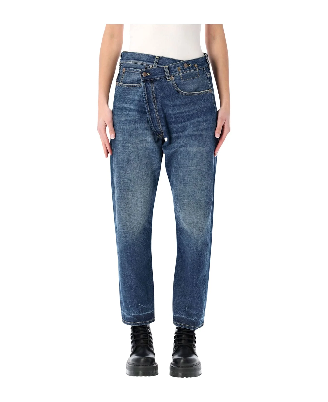 The R13 Crossover Jeans Reinterpret Classic Denim With A Bold, Deconstructed Twist. Featuring An Asymmetrical Crossover Waistband And A High-rise Fit, They Create A Distinctive Layered Effect While Remaining Flattering And Wearable. The Five-pocket Construction And Premium Cotton Denim Ensure Durability, Comfort And A Lived-in Look That Evolves Over Time. High-rise Fit Asymmetrical Crossover Waistband Five-pocket Design Straight Leg Premium Cotton Denim Alessandra Is 1,75 M And Wears Size 26 Composition: 100% cotton Made in: Italy Color: OASIS BLUE Model number: R13W2048D381CD381C