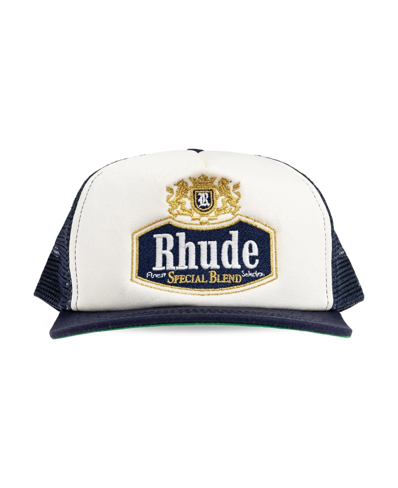 Discover the epitome of contemporary sophistication with this striking Rhude Snapback Cap. Meticulously crafted, the cap features a structured white front made from smooth textile, elegantly contrasted by a deep navy visor and breathable mesh back. Accentuated by distinctive exposed stitching and a refined plastic snapback closure, this accessory perfectly balances functionality with exquisite detailing. The front is adorned with a boldly embroidered shield emblem, showcasing the prominent 'Rhude' inscription, the phrase Composition: 65% Polyester 35% Cotton Made in: Bangladesh Color: BLUE Size and fit: - brim: 5.5 centimetres, circumference: 57.0 centimetres Model number: RHPF25HA017423039