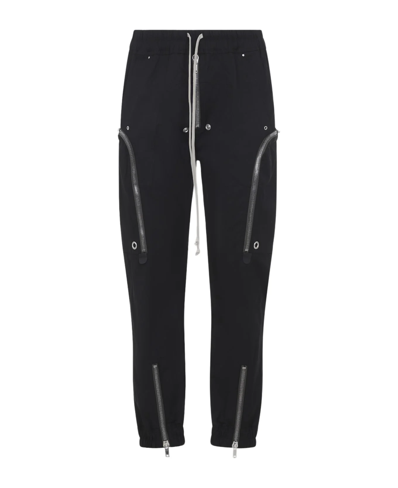 Rick Owens Bauhaus Cargo Black Cotton Pants. Flared pants crafted from black cotton, featuring an elastic waistband with the iconic drawstring, a front zip fastening, silver-toned metal eyelet detailing, slant pockets, side cargo zip pockets, back flap pockets, zip at the cuffs, and a slim fit. Made in: Italy Color: Black Model number: RU01F2377TE09