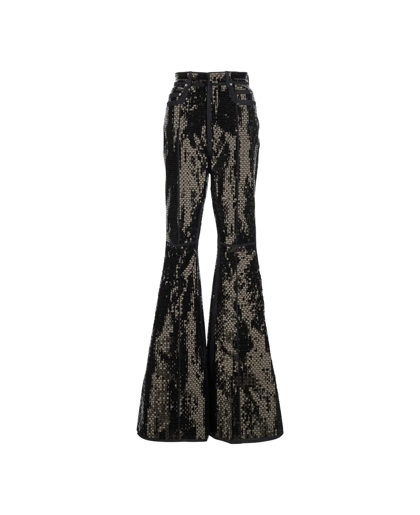 Jeans Black High waist Belt loops Front button and zip closure Wide leg Flare design Straight hem Five-pocket design All-over sequins Denim Relaxed fit Composition: 91% Cotton 6% Elastomultiester Made in: Italy Color: Black Model number: RP01F6329SRAKM30994
