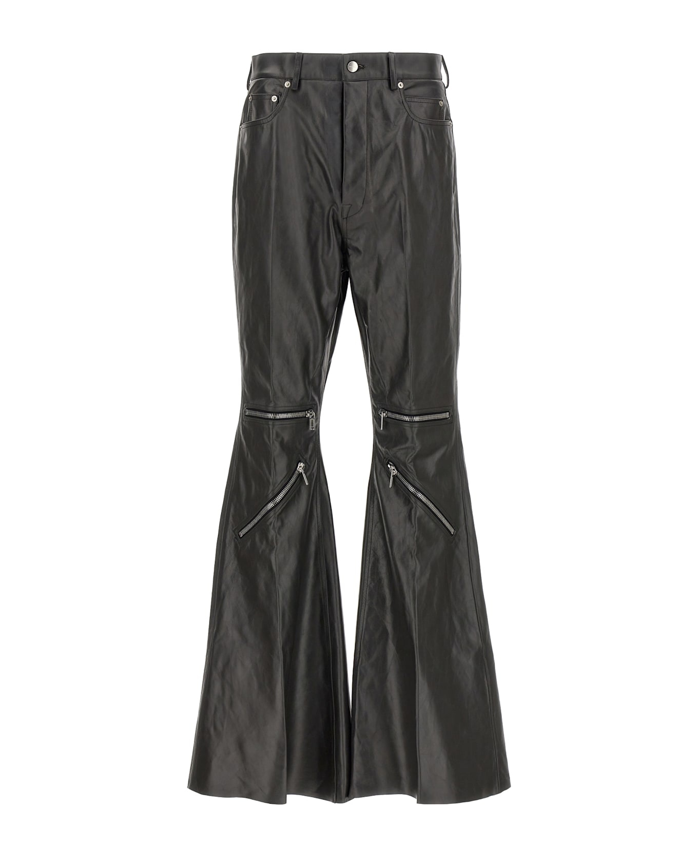 'Bolan Cargo' high-waisted calf leather pants with floor-length boot-cut leg, front zip, front button closure, five pockets, leg bottoms with raw cut hem. Composition: 100% calfskin leather (Bos Taurus) Made in: Moldova Color: Black Size and fit: - true to size fit Model number: RU01E5336LTP09