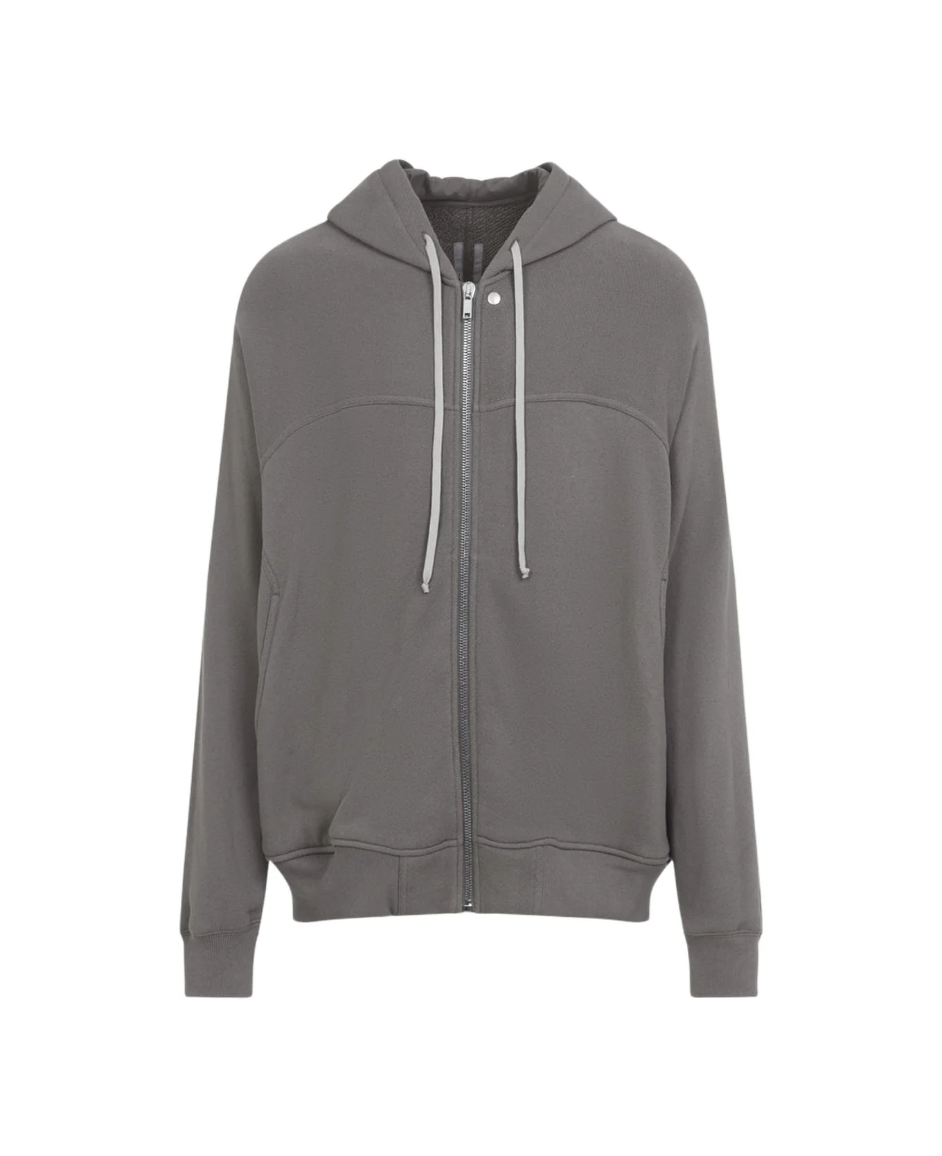 Rick Owens Grey Cotton Sweatshirt. Crafted from grey cotton, featuring a hood with a signature long drawstring, a front zip fastening, front inseam pockets, dropped shoulders, long sleeves, and ribbed edges. Made in: Italy Color: Dust Model number: RU01F2241JNT34