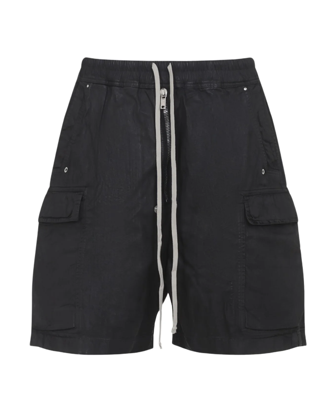 Rick Owens DRKSHDW Cargobela Black Cotton Shorts. Crafted from washed black cotton, featuring an elastic waistband with the iconic drawstring, a low crotch, a front zip fastening, silver-toned metal eyelet detailing, side pockets, two side cargo pockets, two welt pockets at the back, and a straight hem. Made in: Italy Color: Black Model number: DU01F4369DBK09