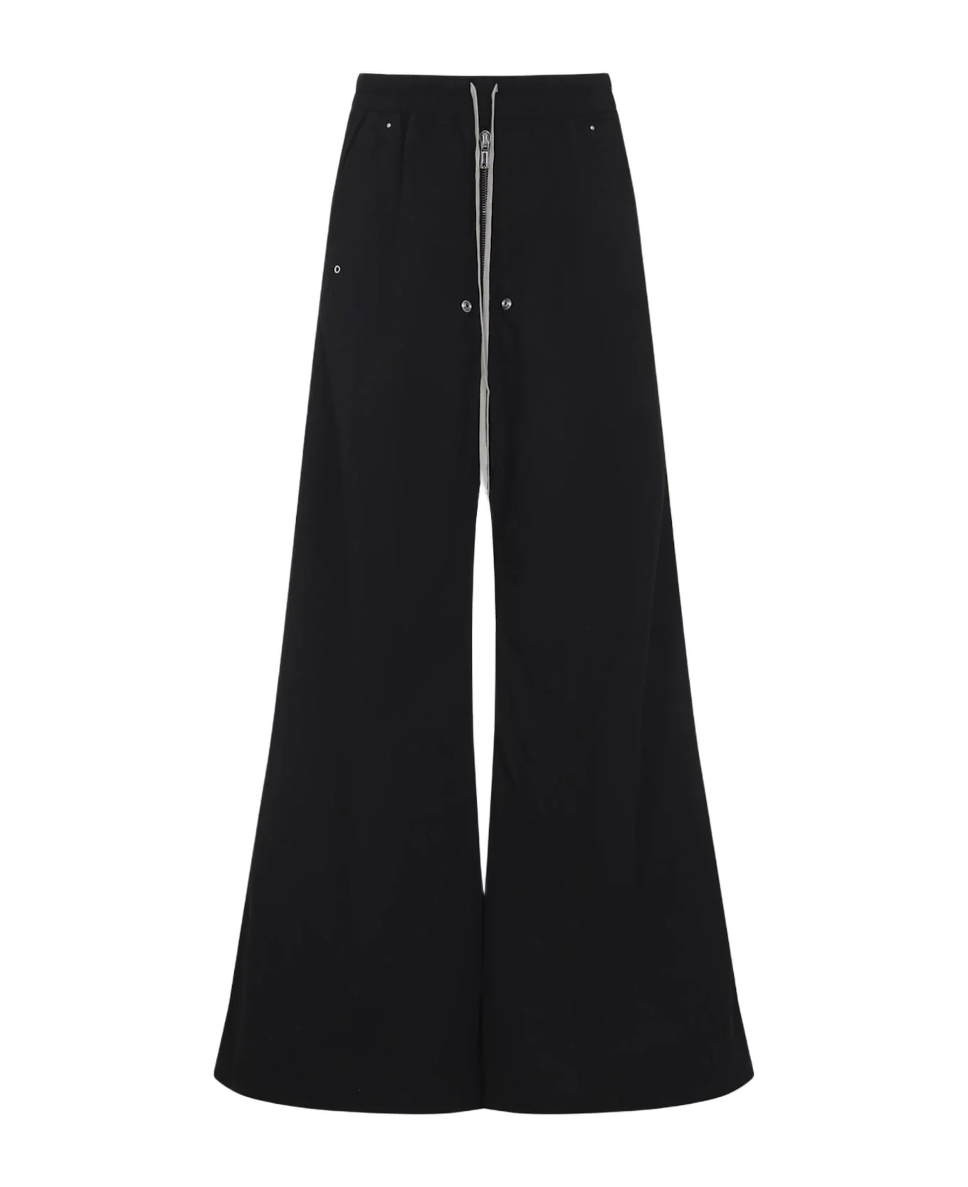 Rick Owens DRKSHDW Geth Belas Black Cotton Pants. Flared pants crafted from black cotton, featuring an elastic waistband with the iconic drawstring, a low crotch, a front zip fastening, silver-toned metal eyelet detailing, side pockets, flap pockets at the back, a wide leg, and a floor-length hem. Made in: Italy Color: Black Model number: DU01F4378CR09
