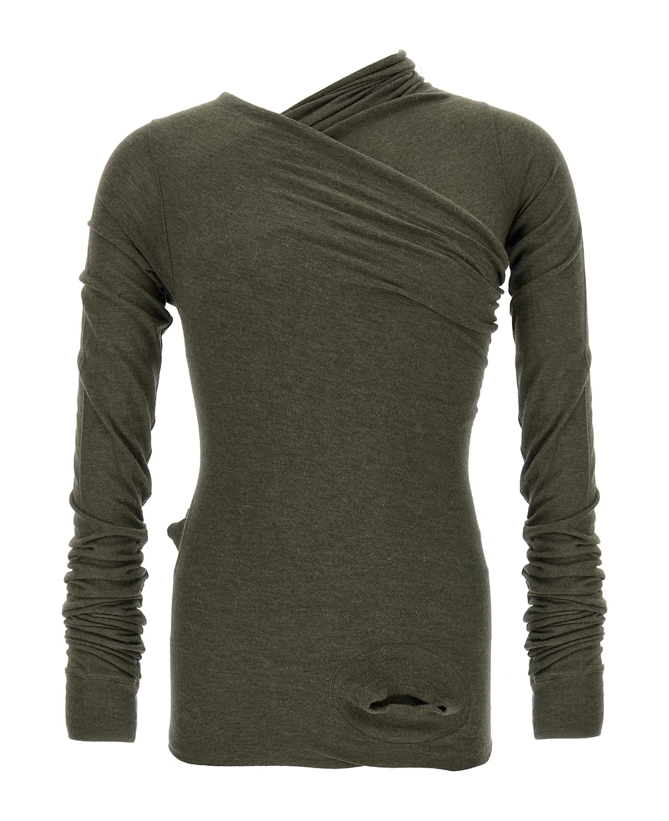 'Hollywood Banana' long-sleeved T-shirt in wool, angora and viscose blend. It has a bottom layer with two round holes with ribbed edges and an outer layer that folds to create a crossed draping on the front and back neck. Composition: 30% polyamide 30% vi 20% wa 20% wool Made in: Italy Color: Green Size and fit: - Slim fit Model number: RU02E1262JR25