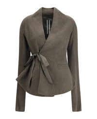 The hollywood jacket by rick owens embodies the brand s bold and contemporary aesthetic, merging sharp tailoring with unexpected details. designed with a v-neckline and a wrap-around closure fastened by a side-tie sash, it balances structure with fluidity. side welt pockets add practicality, while the ruffled hem at the back introduces a touch of movement. presented in a melange pattern with a regular fit, this piece showcases rick owens distinctive approach to modern tailoring. Composition: 30% % Viscose, 30% % Nylon, 20% % Wool, 20% % Rabbit Hair Model number: RP02E4707DBC25