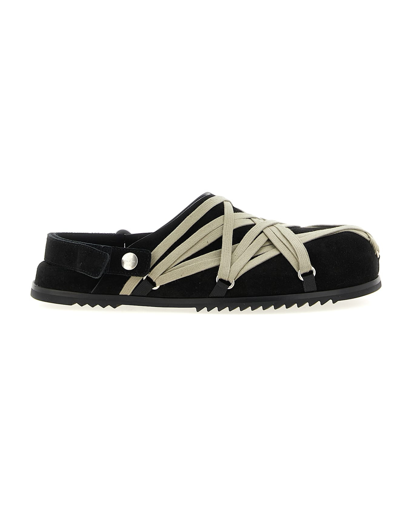 'Megalace Mule Granola' suede mules with front lace detail, adjustable strap with velcro, rubber sole. Composition: 100% calfskin leather (Bos Taurus) Made in: Italy Color: Black Size and fit: - EU MEN Model number: RU02E1813LVSW109