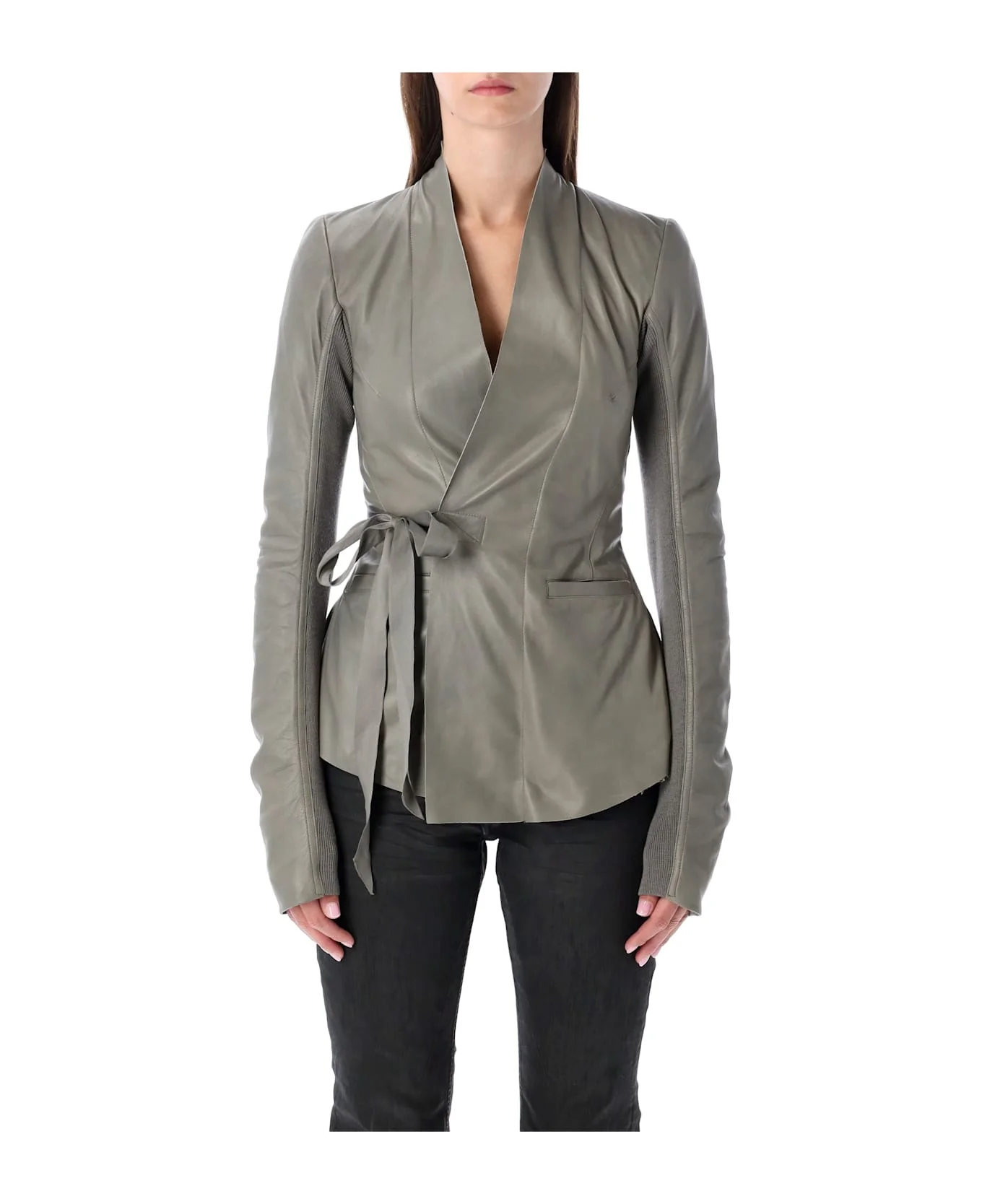 The Rick Owens Leather Wrap Jacket Embodies The Label's Sculptural Tailoring And Contemporary Elegance. Made From Supple Leather, It Features A Deep V-neckline, Side Tie Fastening And A Structured Waist That Flows Into Pleated Details At The Back. The Elongated Sleeves And Clean Lines Enhance Its Refined Silhouette, Making It A Distinctive Piece That Balances Strength And Femininity. Deep V-neckline Side Tie Closure Structured Waist Pleated Back Panel Elongated Sleeves Fitted Tailored Cut Alessandra Is 1,75 M And Wears Size 40 Composition: 100% lamb leather Made in: Moldova Color: WASHED INDIGO Model number: RP02E4707LBY06