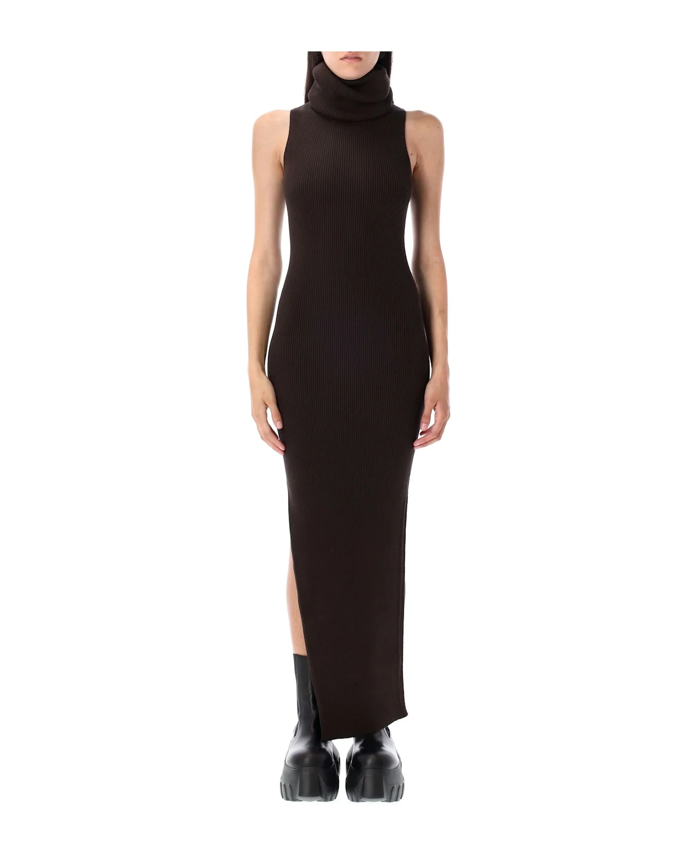 Tube Dress By Rick Owens. Featuring: Turtle Neck Sleeveless Rib-knit Side Slit Ankle Length Slim Fit Model Is 1,70 M And Wears Size S Composition: 68% viscose, 32% polyester Made in: Italy Color: BROWN Model number: RP02E4661RIBVI04