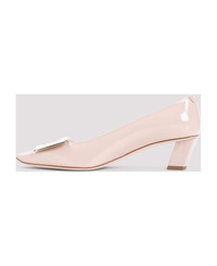 Roger Vivier Belle Pink Calf Leather Pumps. Crafted from pink patent calf leather, squared toe, silver-toned metal plaque on the top. Slanted block heel. Leather insole and outsole. Made in: Italy Color: Collant Size and fit: - Heel high: 4,5cm Model number: RVW00600920D1PC211