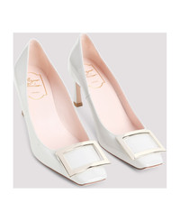 Roger Vivier Belle Trompette Ghiaccio medio Calf Leather Pumps. Crafted from white patent calf leather, squared toe, silver-toned metal plaque on the top. Slanted heel. Leather insole and outsole. Made in: Italy Color: Ghiaccio Medio Size and fit: - Heel high: 7cm Model number: RVW40015280D1PB017