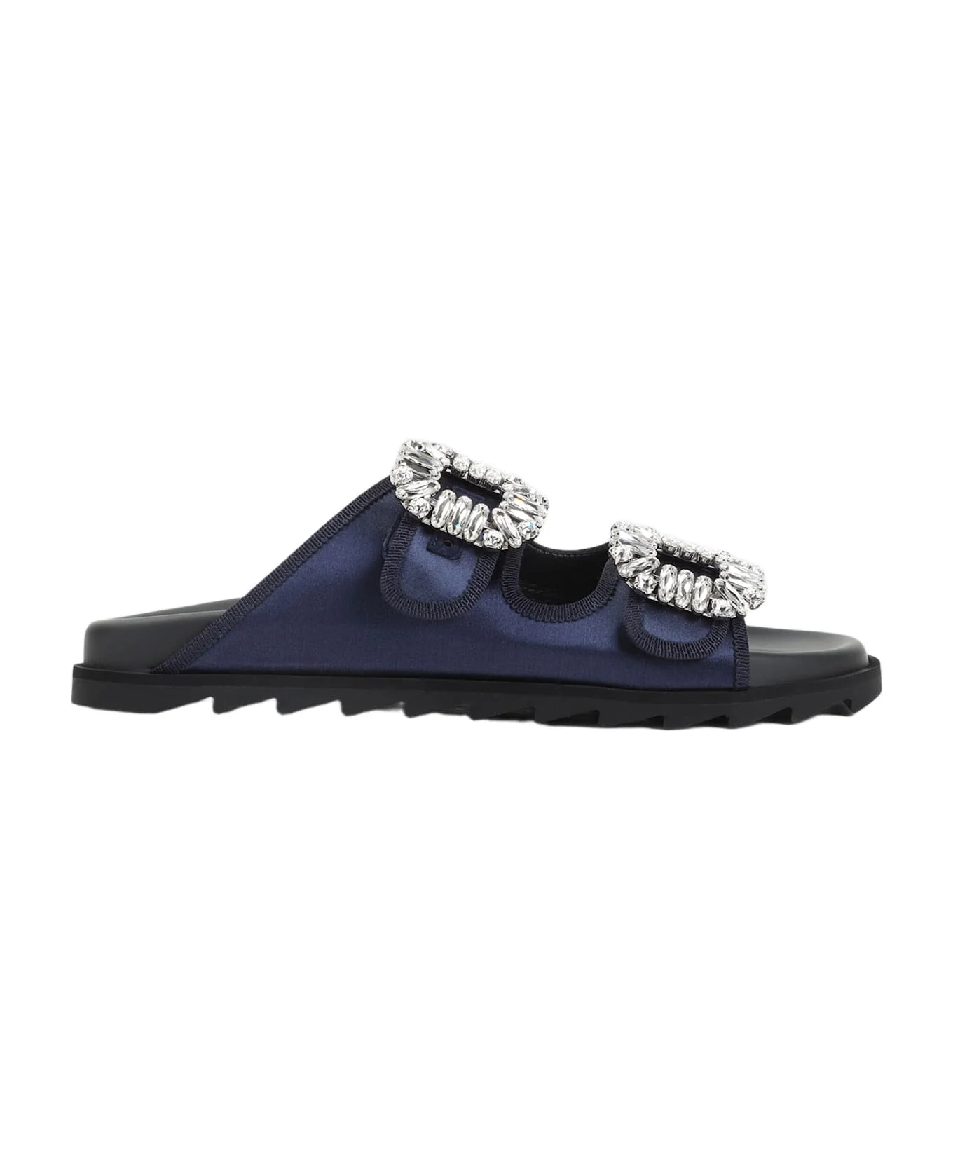 Roger Vivier Slidy Strass Bord Gros Blue Satin Mules. Crafted from blue satin, tonal grosgrain trim, open round toe, adjustable straps with iconic crystal plaque details, leather lining, notched rubber outsole. Made in: Italy Color: Indigo Model number: RVW45844480RS0U807
