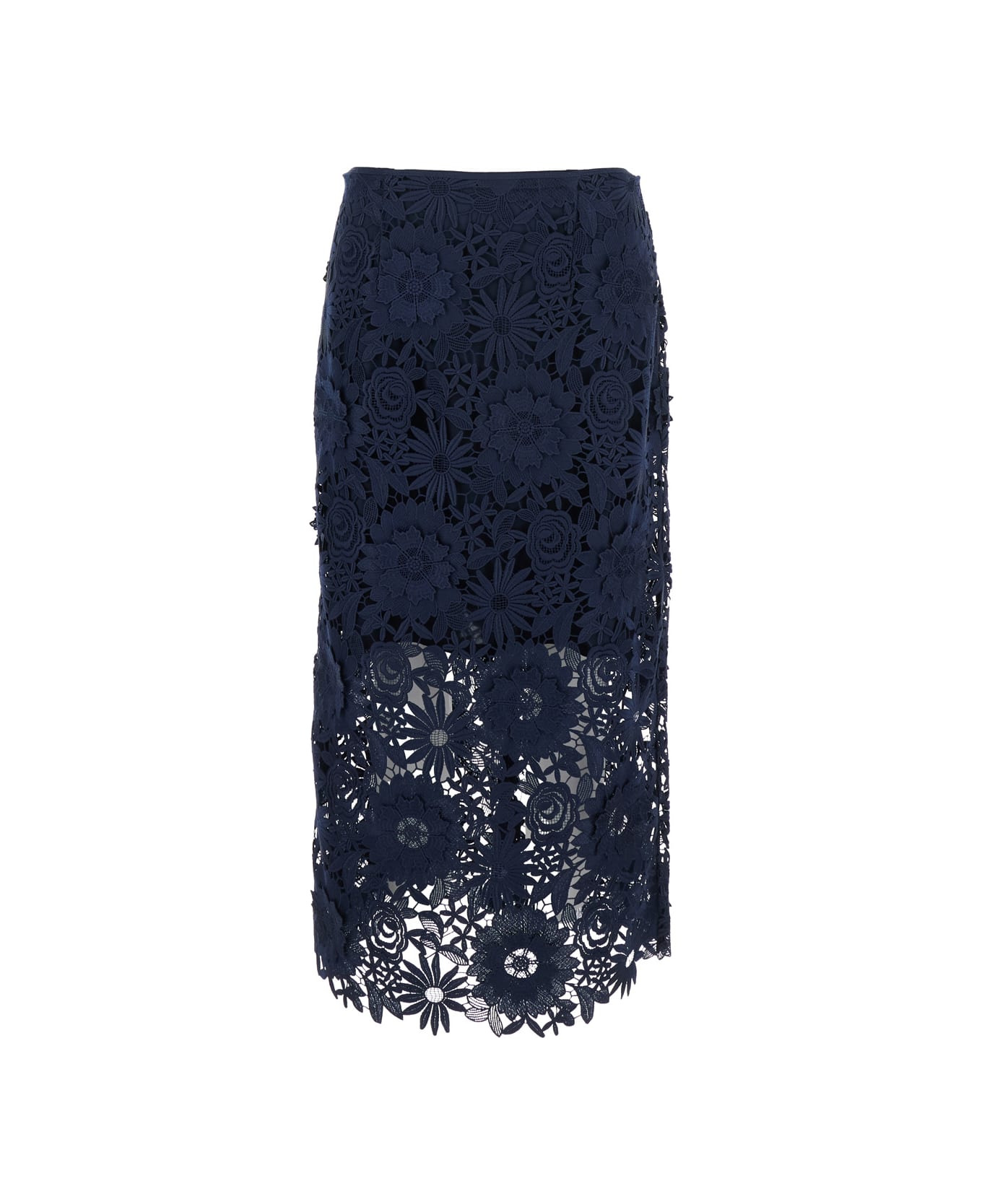 Blue Skirt With Semi Transparent Design And Floral Decorations In Fabric Woman